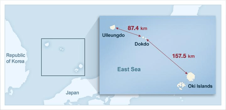 Map showing the distance between Dokdo and the nearest island from both countries.